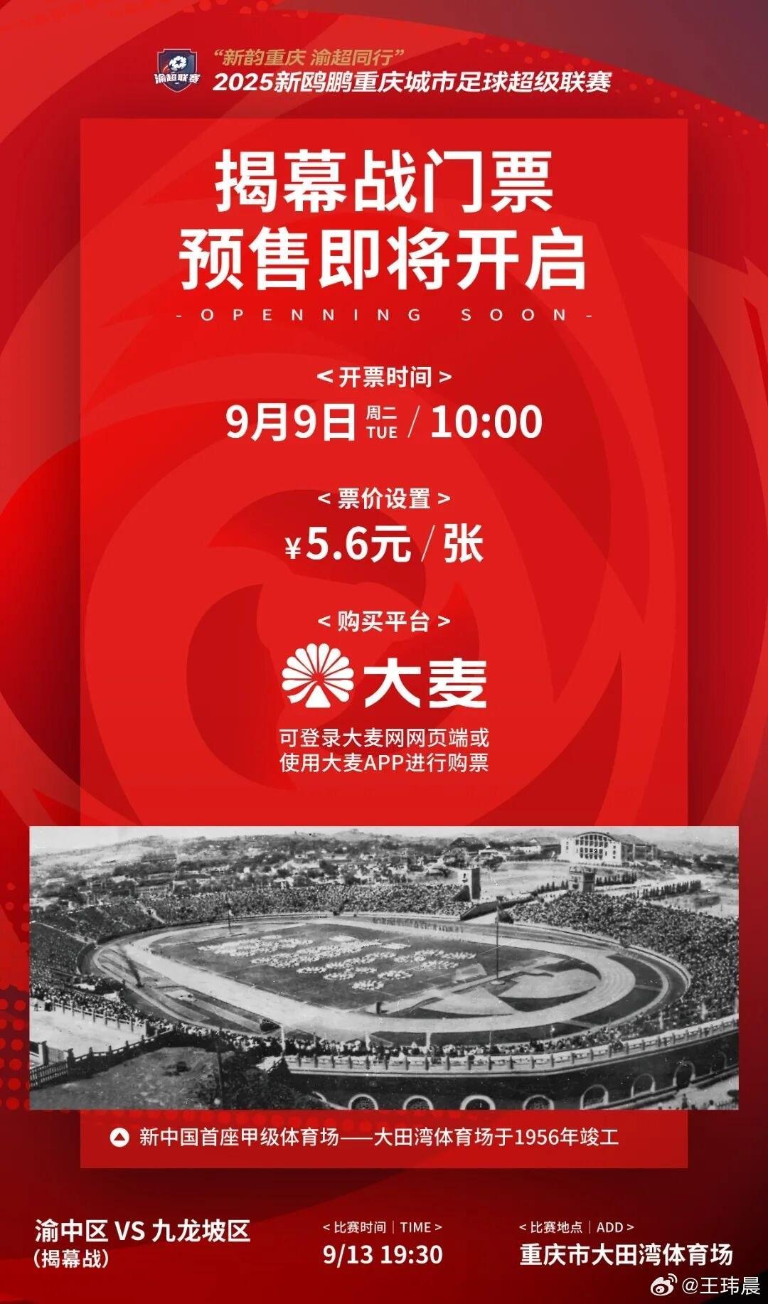 据了解,渝超揭幕战将于9月13日晚7时30分在重庆大田湾体育场打响,对阵双方为渝中区队与九龙坡区队。此次票价定为5.6元,源自大田湾体育场的历史渊源——作为新中国成立后重庆首座甲级体育场,大田湾体育场于1956年建成并举办首场大型赛事。组委会表示,5.6元既是对历史的致敬,也寓意“体育惠民”的初心。